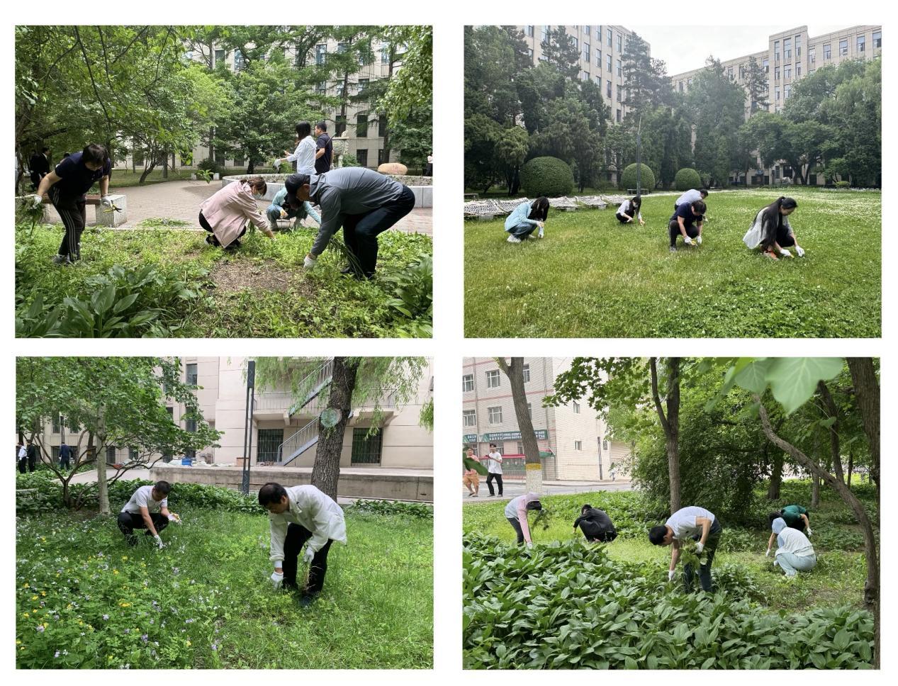 面对草坪中横生的野草、树木上生长的萌蘖,大家迅速进入到工作状态,有序组成爬犁组剪刀组除草组,热火朝天投入到劳动活动中。大家分工协作,在主楼周边的林地开展地毯式清理。有的徒手拔草,有的挥耙清除,有的手握工具,汗水打湿衣服,泥巴沾满鞋袜,大家依然干劲不减,呈现出一片除草忙的景象。人多力量大,经过大家的共同努力,绿地焕然一新。