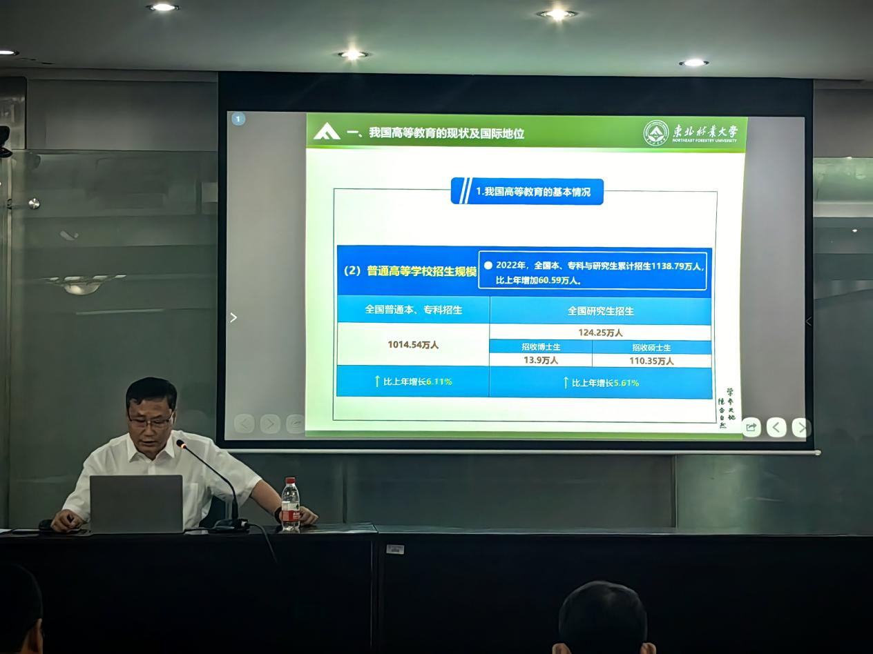 6月16日下午,东北林业大学校长宋文龙在综合办公楼1113会议室,以《贯彻党的教育方针,落实立德树人使命--浅谈高校高质量人才培养》为题,讲授专题党课。本科生院、研究生院全体党员以及各学院分管本科生教学和研究生教学工作的相关领导参加党课学习。