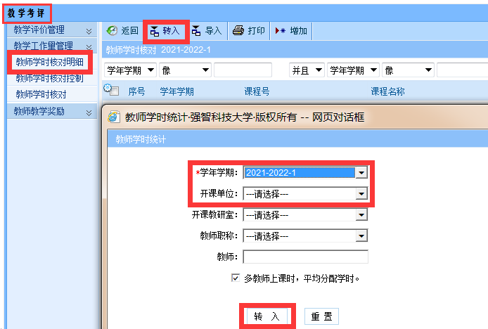 教学秘书登录教务系统,点击教学考评—教学工作量管理—教师学时核对明细,点击上方转入按钮,选择正确的学年学期,开课单位等,点击下方转入按钮,即可生成本学期拆分任务条数。