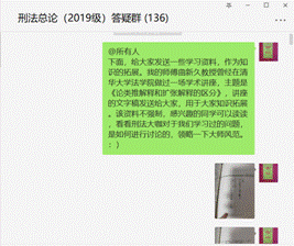 为保证网络教学质量,实现教学目标和学习效果,赵权老师与学院老师多次研讨,结合学生居家学习特点,有针对性地精心准备课程内容。针对学生教材资源不足的问题,赵老师在原有课件基础上,重新制作、完善课件内容,使得教学讲义达到出版标准,同时准备PPT和word两个版本。PPT用于直播授课,word版本发送给学生用于预习和复习。全部课件累计字数34万余字,囊括国内顶级权威教材9本,法律职业资格考试权威教材4本,教学案例3000多个,司法实践案例1000多个,裁判文书50余篇,刑事辩护词30余份;在授课形式准备上,建立“刑法总论答疑微信群”;选择雨课堂、腾讯会议、一直播平台作为直播教学平台以及备选平台;在正式开课前,累计进行平台测试4次;正式上课后,每天提前15分钟建群,教师与学生提前完成直播授课准备工作;同时兼顾学生用眼健康,将课程时间均分为三部分,每授课30分钟休息10分钟。该课程学生出勤率100%,甚至很多其他专业、其他年级同学也来旁听。