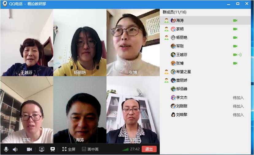 疫情面前,概论教研部的全体教师感受到了身上担子的重量。在疫情期间无法聚到一起面对面的开会交流,概论教研部利用网络召开视频会议,研讨新冠肺炎疫情防控期间在线课教学工作。概论教研部全体教师以QQ视频会议的形式召开了学期前的集体备课工作会议。与会十一位老师充分利用线上交流的方式,踊跃发言,各抒己见,集体备课氛围极为热烈。同时,为了更好适应线上教学,避免出现不可预知的问题。课前,概论教研部每一位教师都进行了课堂实际教学模拟。老师之间演练还不够,每一位教师还提前与学生联系好,正式上课前,预定好时间,进行了一次真正的线上课堂演练,将所有可能出现的问题都消灭在萌芽中,确保万无一失地开始线上教学第一课。