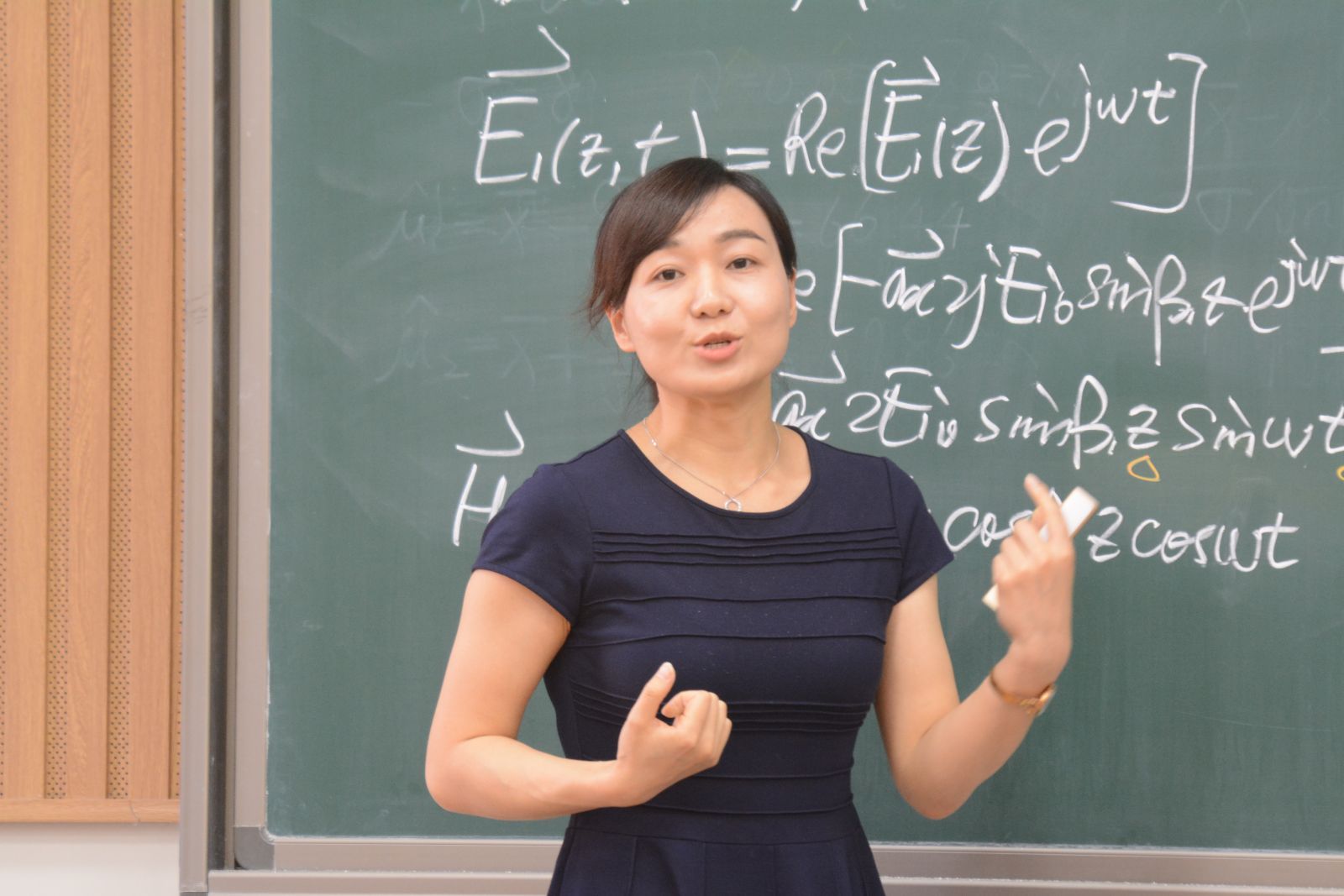 宗华老师通过隐形飞机何以隐身的问题导入,激发了学生对“均匀平面波理想导体的垂直入射”课程知识的学习兴趣,从上一节所学知识的引申,利用动静结合的PPT,通过深入浅出地讲解,层层推导出合成波的表达式,清晰阐述了驻波的形成过程及合成波的特点,最后利用合成波的特点给出了隐身飞机的隐身原因。在谈到在教学备课感悟时,她认为,依据教材,同时需要选择至少三种比较权威的教学参考书;在进行教学设计时,需要贯彻以学生为中心,以学生学习成效为驱动的教育理念,恰当使用现代教育技术和教学手段与方法;同时强调知识的逻辑性,条理性,做到前后呼应;在教学过程中,有效利用课堂进行即时的教学反馈,从而提高教学质量。在谈到进行教学竞赛的准备时,宗老师指出,不能孤军奋战,需有效利用教学团队,要善于学习和借鉴,多练多学,及时发现自身的缺点和问题。