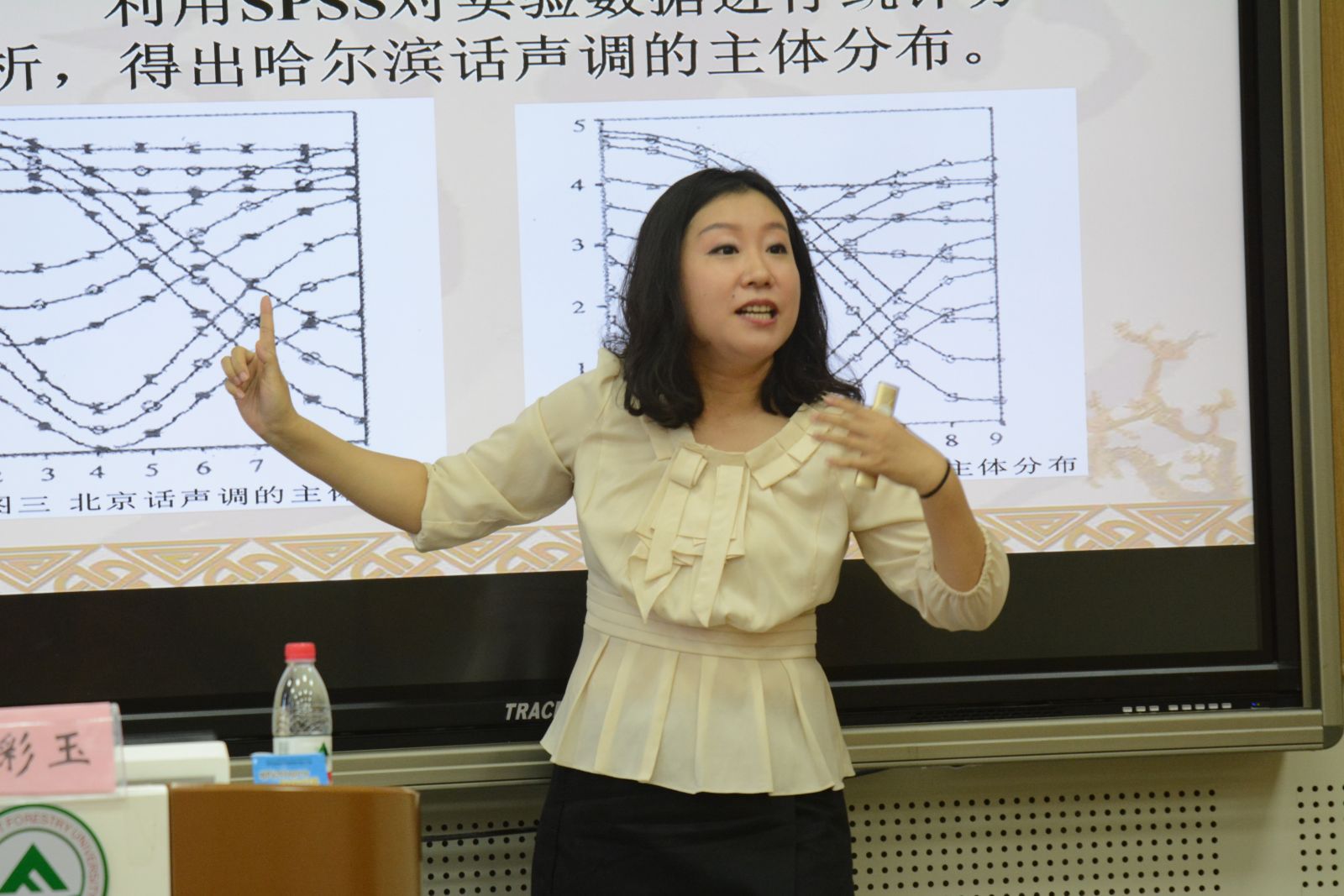 黄彩玉老师从一位留学生的汉语发音谈起,层层递进,讲解了“现代汉语”课程中“声调”的内涵、调值和调类及前沿问题的思考。黄彩玉老师循循善诱,落落大方的教态让学生亲切的感受到声调是汉藏语系的代表特征,给出了声调的确切含义,对58例哈尔滨话的语音样本采集,再通过SPSS等软件处理后与北京方言的语音样本比较和小组讨论后,让学生充分理解了声调的调值和调类深刻含义,声调的实际表现为声学空间,声调的动态段预示着语言发展的方向,体现汉藏语系音调的独特魅力。黄老师讲课语言朴实、亲切,教态优雅大方,课程前后衔接自然,注重呼应,重点、难点突出。示范课结束后,黄老师通过教学竞赛总结出了四点经验:一是体现出设计感和问题意识。二是每一句话都不是白说的。三是教学内容让多数评委能听懂。四是放松心情,看淡得失。