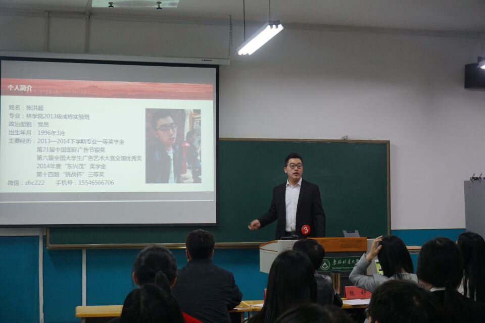 林学院成栋实验班的张洪超同学第三个登场,向我们讲述了“时间管理”。《时间都去哪了》这首歌我们都很熟悉,张洪超同学由此入手,首先阐明时间的对象是个人而不是时间,接着指出我们觉得时间不够用是因为我们利用时间的效率不高。然后,他详细地告诉我们如何合理利用时间,避免拖延现象发生。在课堂的最后,张洪超同学呼吁我们要珍惜时间,做时间的主人,引发了每个人对时间的思考。