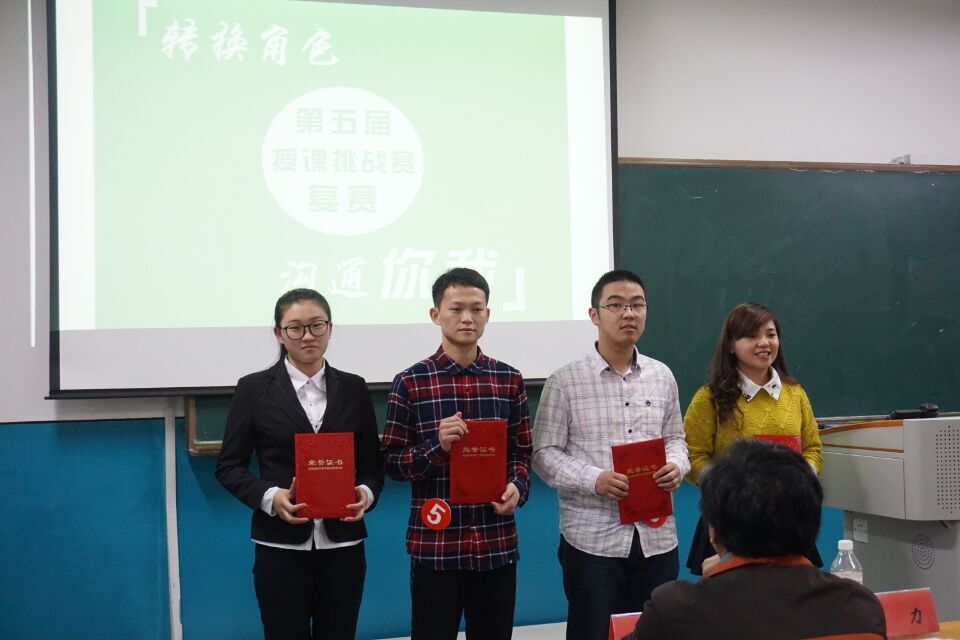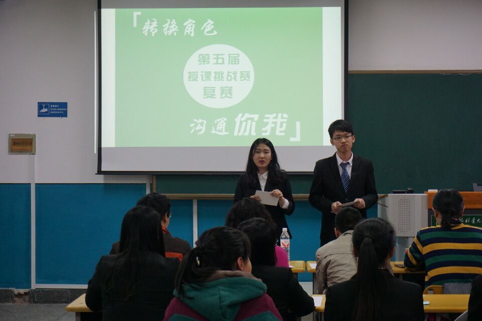 四月二十七日晚六点,由校学生教学信息中心主办的第五届校园授课挑战赛复赛第一场于锦绣楼402隆重举行。出席本次比赛的评委老师有:来自文法学院的宫立明老师,来自图书馆的何力老师,来自林学院的邹传山老师,来自信息学院的穆丽新老师以及来自材料学院的叶方老师。真诚地感谢各位老师在百忙之中抽出时间来担任此次比赛的评委老师!接下来,让我们一起来回顾一下这场激烈的比赛。