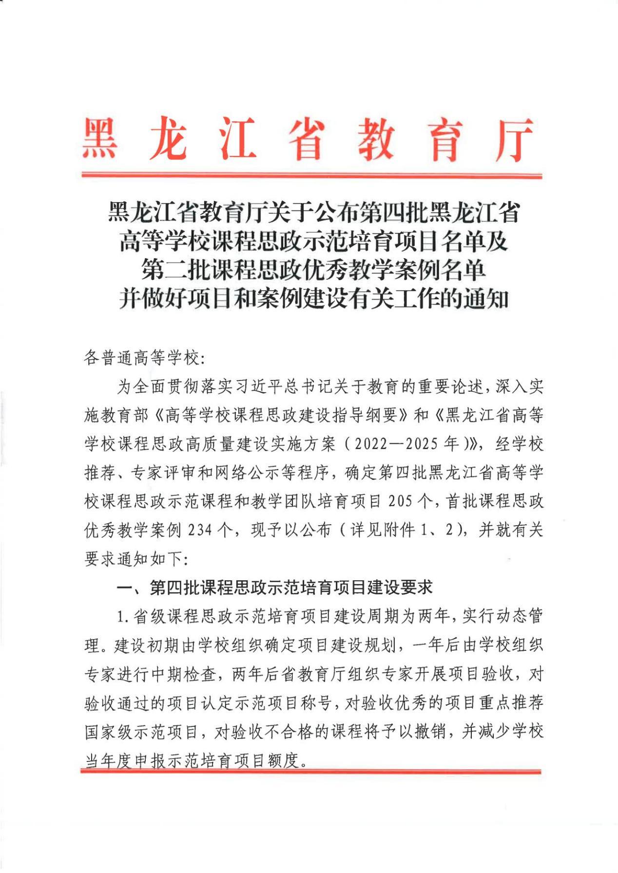 l 3月,我校获批第四批黑龙江省高等学校课程思政示范课程和教学团队培育项目4个,第二批课程思政优秀教学案例5个