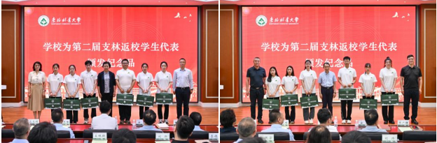 仪式上,与会人员观看了第二届支林返校学生工作汇报视频“青春筑梦绿海间”。返校学生周柯儿代表第二届支林先锋队感谢服务单位与学校的支持与培养,总结自己在林区工作一年的收获与成长,并表示将把支林所学所感融入未来的科学研究中,努力为林业行业发展作出更大贡献。与会领导为先锋队成员颁发了满载母校祝福与期盼的纪念品。