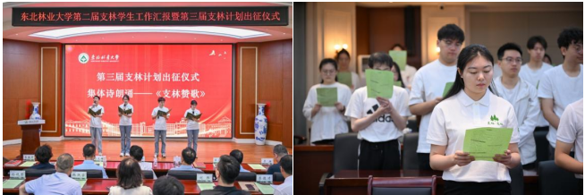 出征学生集体诗朗诵“支林赞歌”。第三届支林先锋队114名成员即将奔赴大兴安岭、伊春、呼伦贝尔等地林业一线开展支援林区建设工作。我校自2021年筹备实施支林计划以来,已派出246名支林学生,为祖国的林业产业高质量发展和生态文明建设事业接力奉献、接续奋斗,贡献着东林青年的智慧和力量。