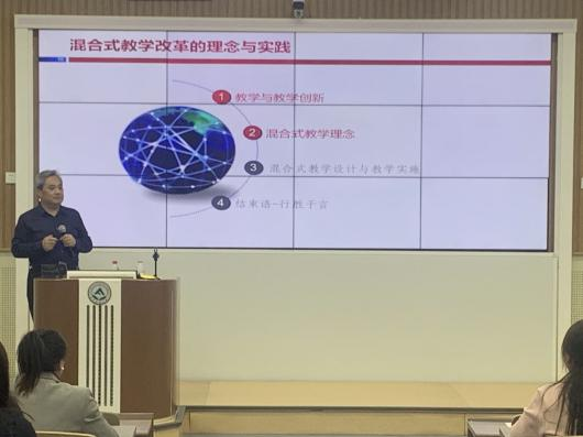 6月4日,邀请国家级教学名师、哈尔滨工业大学教授战德臣以《混合式教学改革的理念与实践》为题作专题报告。第四期骨干教师研修班学员和申报开展线上线下混合式教学的教师参加本次培训。