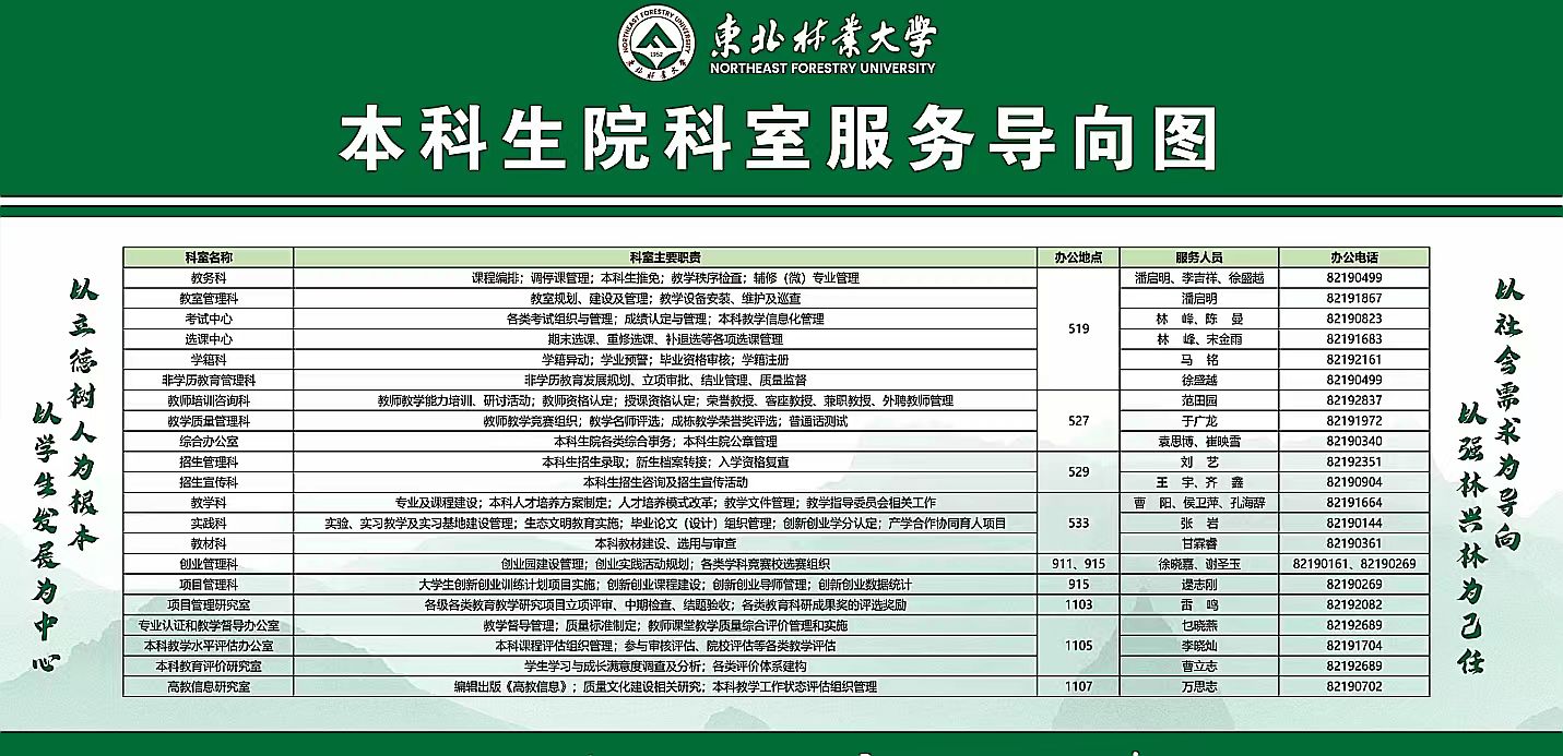 缘林而生,因林而兴,伴林而行。东北林业大学历经七十余载,七十余载风华铺就筑梦路,七十余载积淀谱写新华章。在未来的学习生活中,同学们将迎接新挑战,树立新观念,最终蜕变成新的自己,愿同学们在大学的知识殿堂中自由探索、追求真理;在大学的人生舞台上挖掘潜力、展现风采;在大学的精神家园里陶冶情操、磨练意志。本科生院将充分发挥“引领、管理、服务、赋能”的工作定位,帮助同学们更好地适应学校,感知社会,规划人生。
