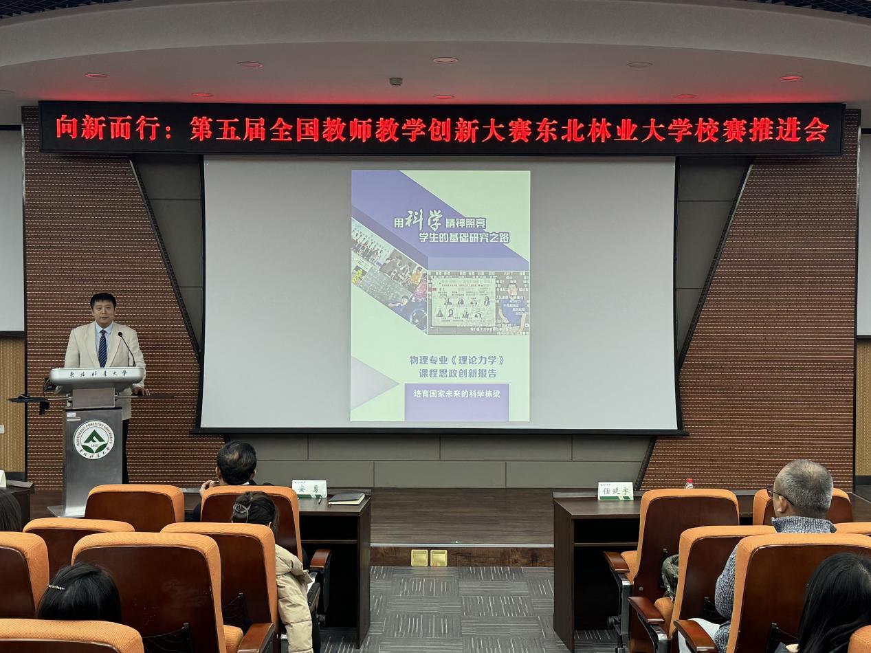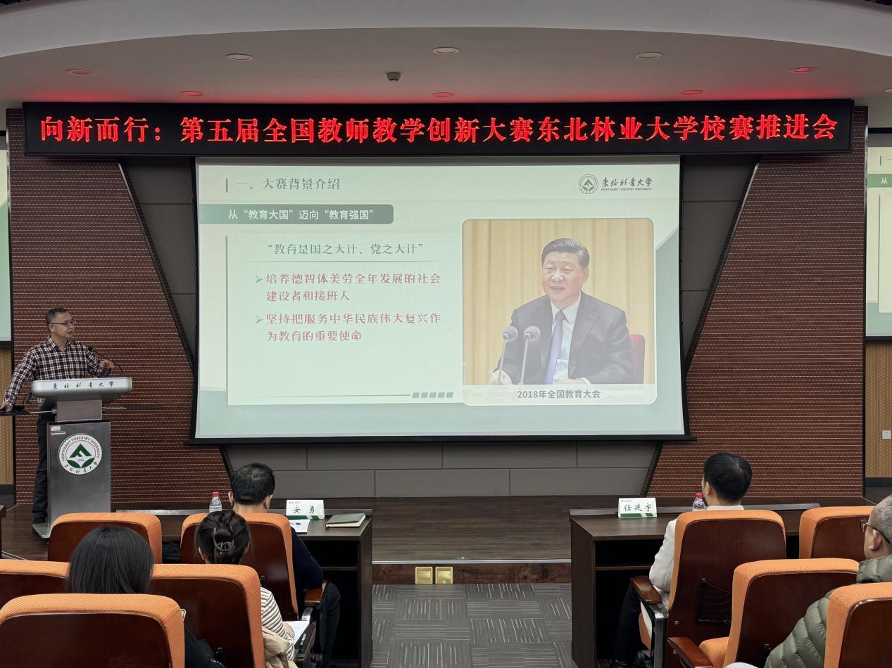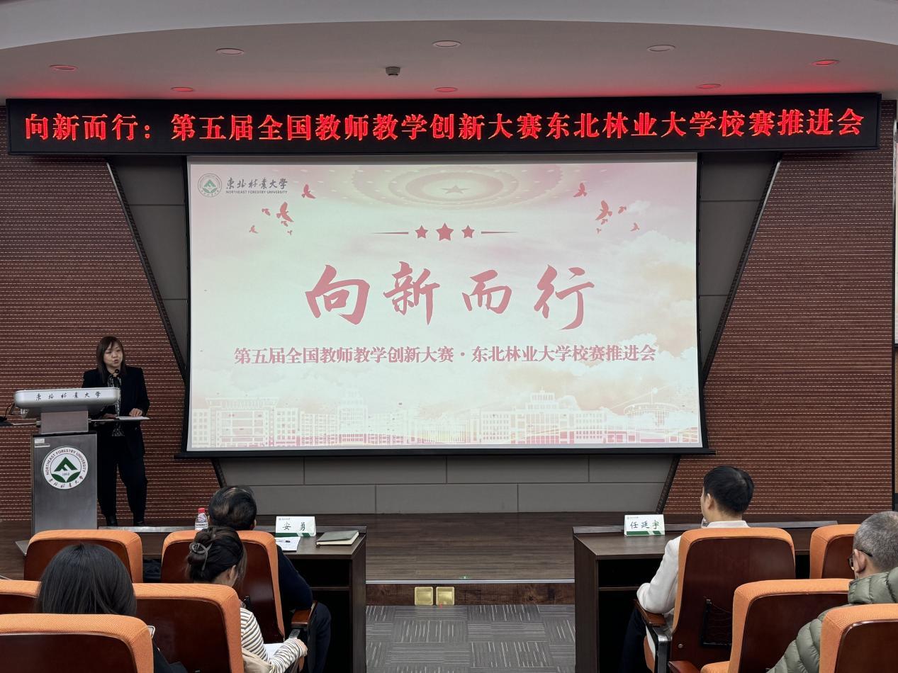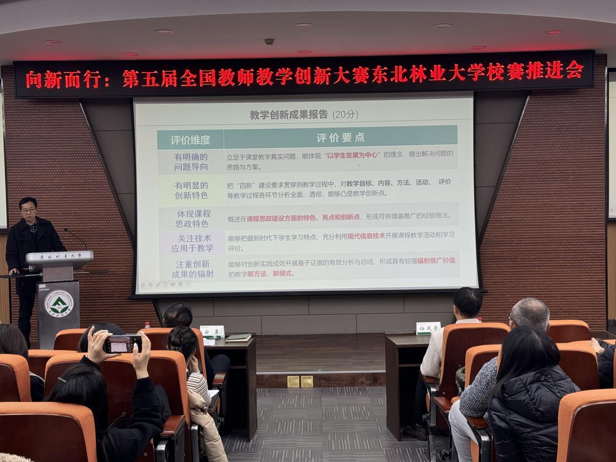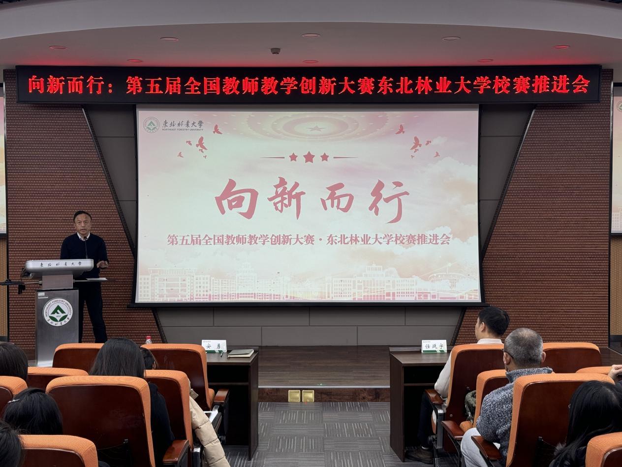 为进一步凝聚共识,明确目标,让广大教师深入了解全国教师教学创新大赛相关事宜,激发创新热情与动力,共同为即将到来的第五届全国教师教学创新大赛加油助力、谋划布局,11月21日,学校在奥林学院101室召开“向新而行”——第五届全国教师教学创新大赛东北林业大学校赛推进会。本科生院常务副院长兼教务运行中心主任安勇、副院长兼培养处处长、教师教学发展中心主任、创新创业中心主任杨洪学出席会议,培养处副处长兼教师教学发展中心副主任孙新竹主持会议。各学院(部)副院长、教学秘书,教师教学发展分中心负责人、第五届全国教师教学创新大赛校选赛参赛教师、新入职教师参会。