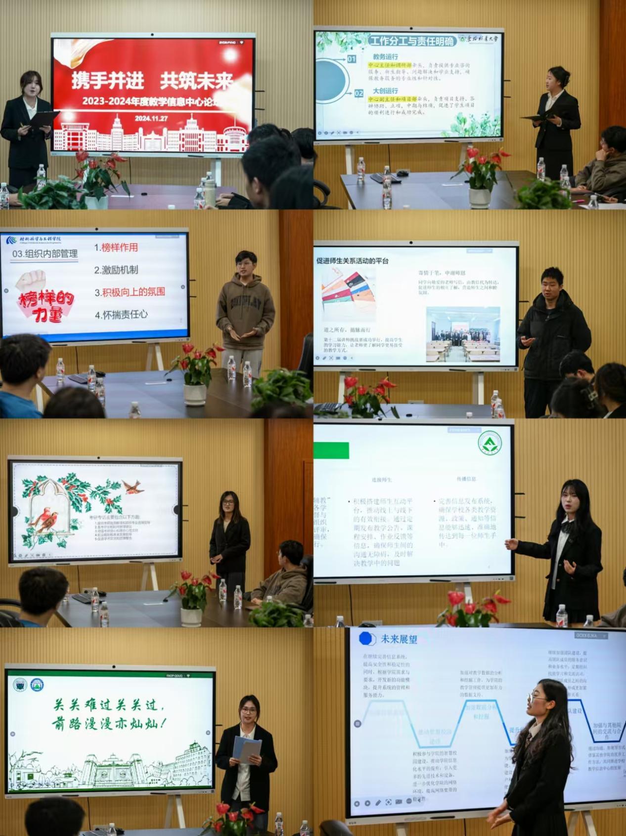 随后,来自材料科学与工程学院、经济管理学院、奥林学院、文法学院、生命科学学院、机电工程学院、理学院的教学信息中心学生代表先后做分享发言,他们结合各自学院教学信息中心的实际工作,分享了中心组织建设、教学管理文件解读、选课指导、保研考研专访、学院特色竞赛、创业经验分享等多个方面的工作经验与成果。同时,他们也坦诚地提出了一些现存的挑战与困难,并就如何进一步完善教学信息中心的工作机制、提升服务水平、推动工作创新等方面提出了宝贵的建议与规划。