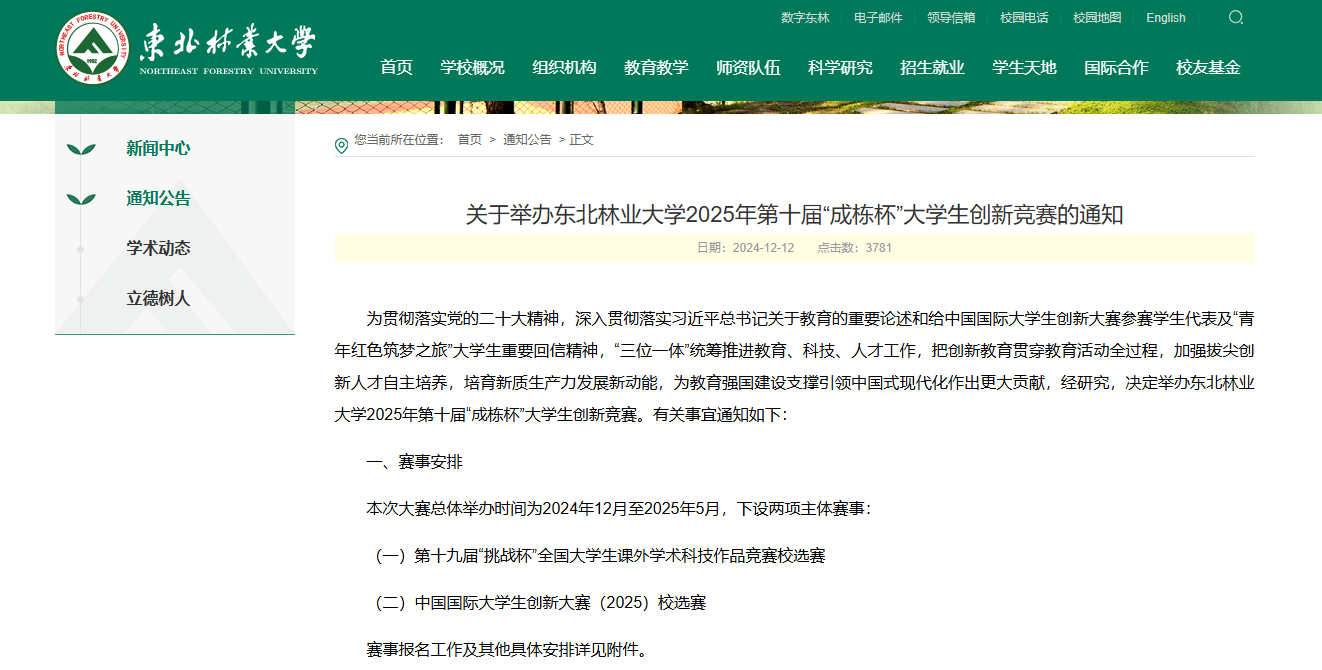 12月12日,发布关于举办东北林业大学2025年第十届“成栋杯”大学生创新竞赛的通知。