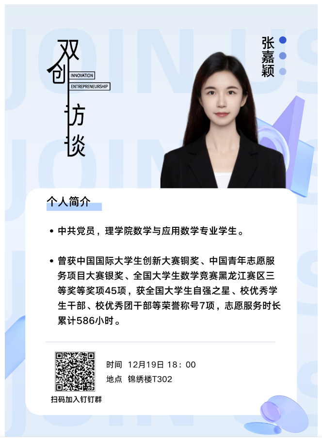 12月19日,举办双创访谈第五十九期:张嘉颖学姐传授参赛经验。