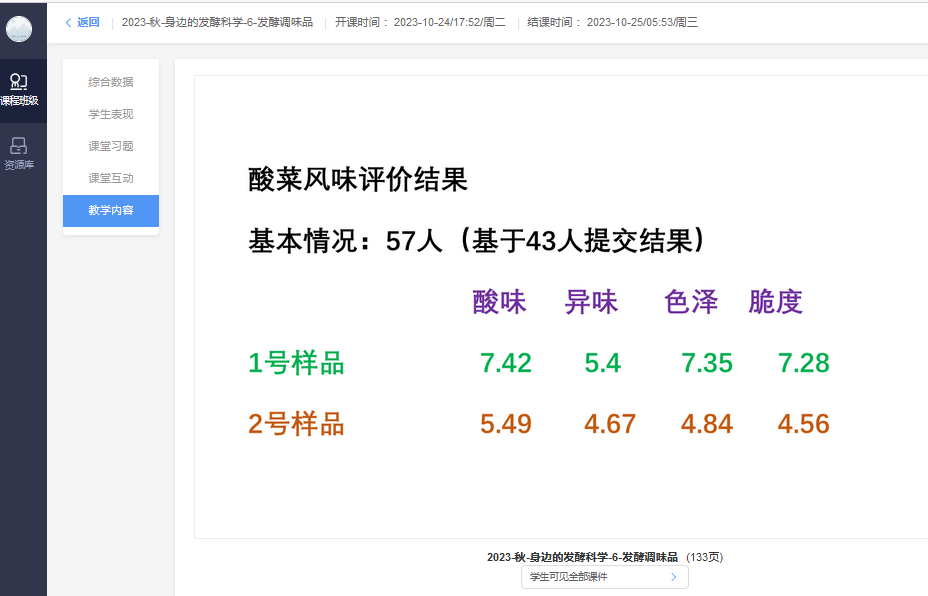 课程集合讲授式、案例式、项目式、问题式、启发式、讨论式等多种教学方法,并将长江雨课堂融汇到课堂教学全程。在与学生充分互动的基础上,深入浅出带领学生畅游微生物发酵的神奇世界。鼓励学生从生物学、化学、食品科学、工程学等多个角度审视发酵过程,促进学生知识的跨学科融合与内化。