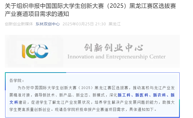 3月25日,组织申报中国国际大学生创新大赛(2025)黑龙江赛区选拔赛产业赛道项目需求。我校积极对接产业需求,广泛动员师生参与,为推动产学研深度融合、助力地方经济发展贡献东林力量。