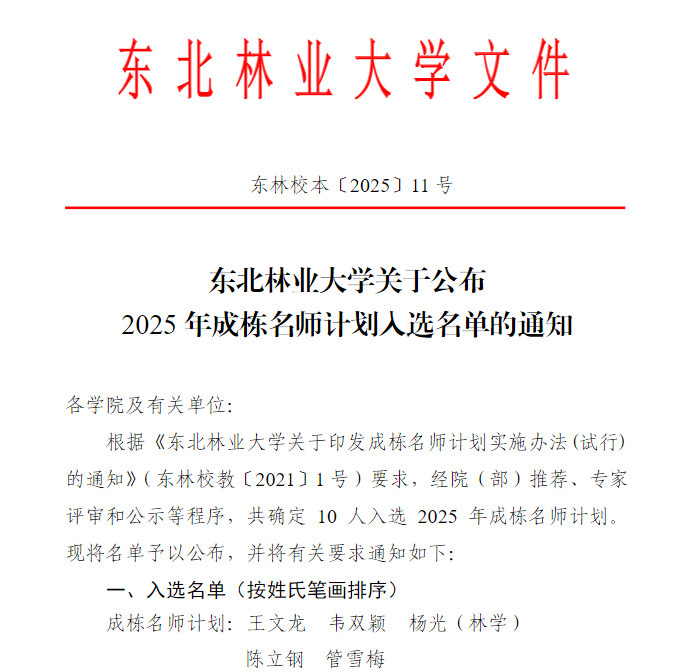 3月13日,发布《东北林业大学关于公布2025年成栋名师计划入选名单的通知》,共确定 10 人入选 2025 年成栋名师计划。