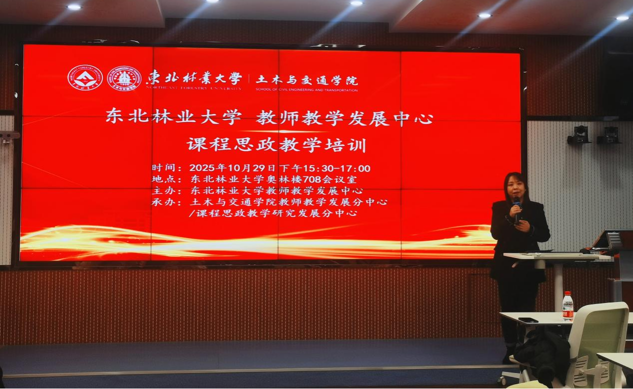为更好地以数智教育破解改革瓶颈,赋能教学创新,提升育人质量和我校教师课程思政教学能力,10月29日,由土木与交通学院教师教学发展分中心/课程思政教学研究发展分中心举办的东北林业大学2025年教学质量文化节系列活动之课程思政教学培训会在奥林楼708会议室进行。本科生院培养处副处长兼教师教学发展中心副主任孙新竹、机电工程学院教学院长李健、计算机与控制工程学院教学院长李丹、本科生院教学发展科科长于广龙以及来自三个学院的50余名中青年教师参加了本次培训会,培训会由土木与交通学院教学院长纪泳丞主持。