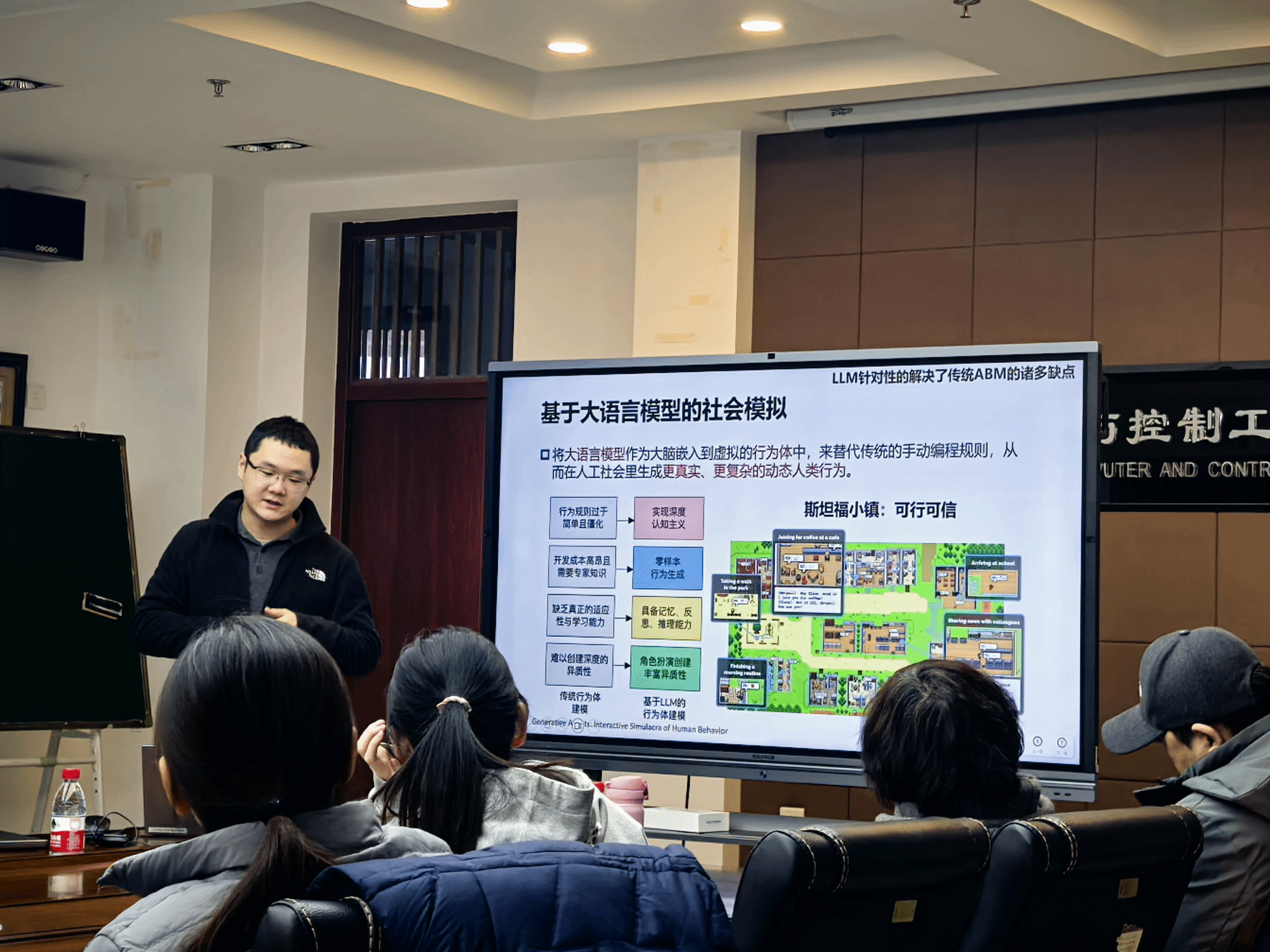 次日(1月13日)上午,在成栋楼1014会议室,特邀香港大学博士后等专家学者作主旨报告。报告内容涵盖《大语言模型在社会模拟中的应用》《AI时代文科如何求存谋发展》等前沿议题,引发与会教师热烈反响。
