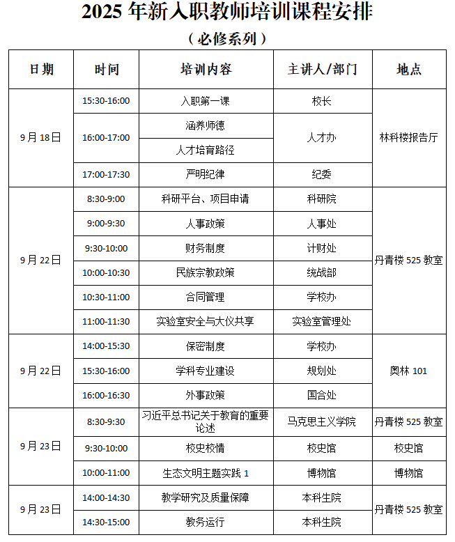 为助力学校一流师资队伍建设,厚植涵养良好师德师风,帮助新教师了解学校历史、发展目标和发展战略,掌握教学工作必备的基本能力,学校将于9月18日至9月23日开展2025年新教师集中培训,有关事项通知如下: