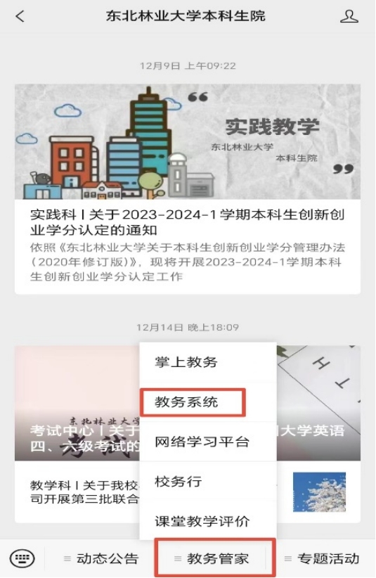 2.通过手机端选课,关注东北林业大学本科生院微信公众号,点击下方“教务管家”-“教务系统”,在弹出的页面中输入账号密码登录。如图6所示。